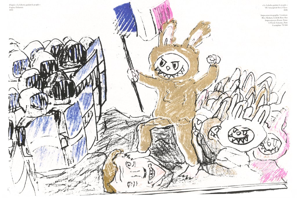 Détournement du chef-d’œuvre de Delacroix « La Liberté guidant le peuple » (1830). Imaginé en pleine manifestation, le projet propulse le Labubu, icône capitaliste, en leader d'une révolution, métaphore de l'ambivalence de notre génération : engagée mais matérialiste. Sur la base du dessin de mon ami graveur Amazigh, j’ai assuré l’adaptation graphique et l’impression clandestine à l’École Estienne. Ce tirage à 100 exemplaires fait s'entrechoquer risographie 3 couleurs (Bleu Medium, Gold, Rose Fluo) et jet d'encre noire, faisant ainsi entrer la culture pop en collision avec l’héritage classique.